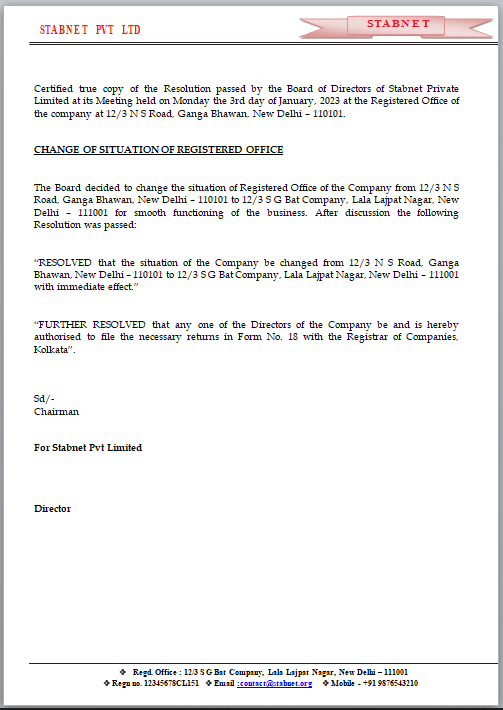 Certified true copy of the Resolution passed by the Board of Directors of Stabnet Private Limited at its Meeting held on Monday the 3rd day of January, 2023 at the Registered Office of the company at 12/3 N S Road, Ganga Bhawan, New Delhi – 110101.